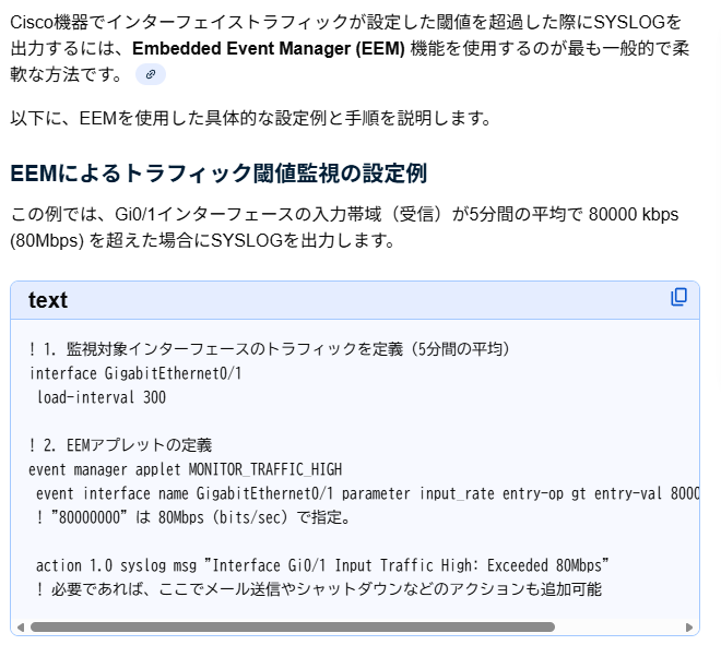 Cisco機器について、入力帯域(受信)の閾値を超えた場合にSYSLOG出力させることはできますが、攻撃検知という意味のトラフィック異常検知はできません。